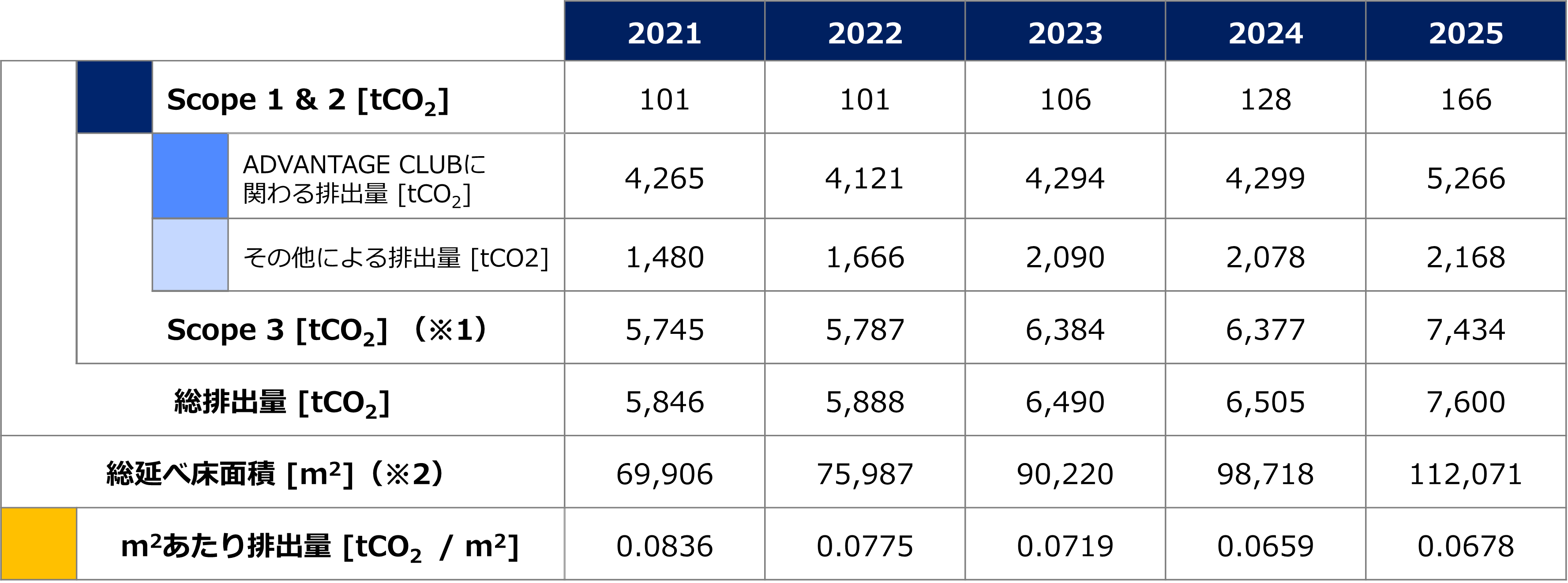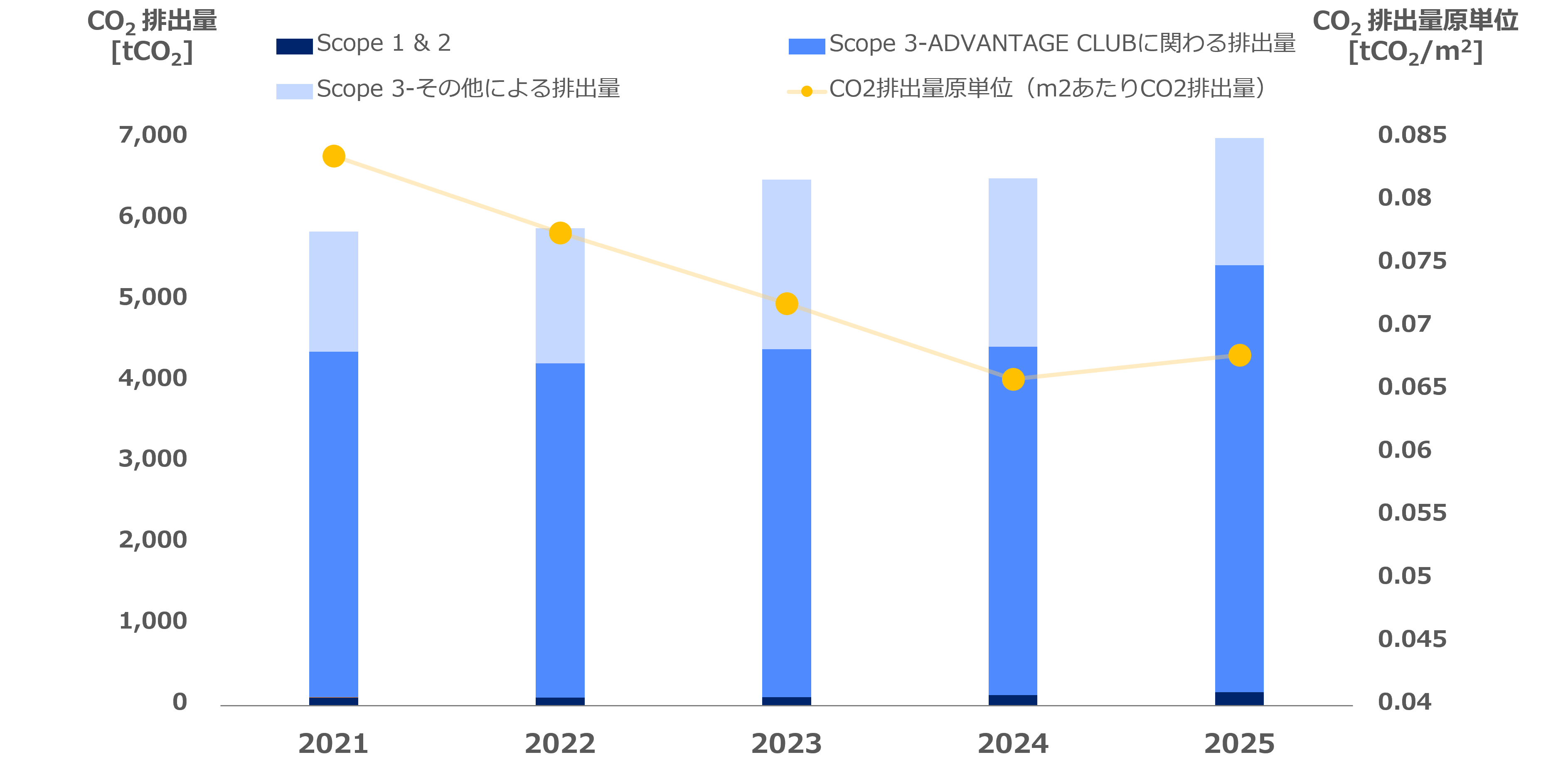 ADVANTAGE CLUBの運用規模拡大、社員数の増加等に伴い、CO₂総排出量は増加傾向にあります。